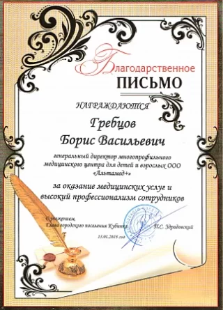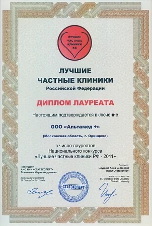 Наша деятельность полностью лицензирована, в связи с чем Вы можете быть на 100% уверены в высоком качестве лечения. Клиника "Альтамед+" признана лауреатом как "ЛУЧШАЯ ЧАСТНАЯ КЛИНИКА"